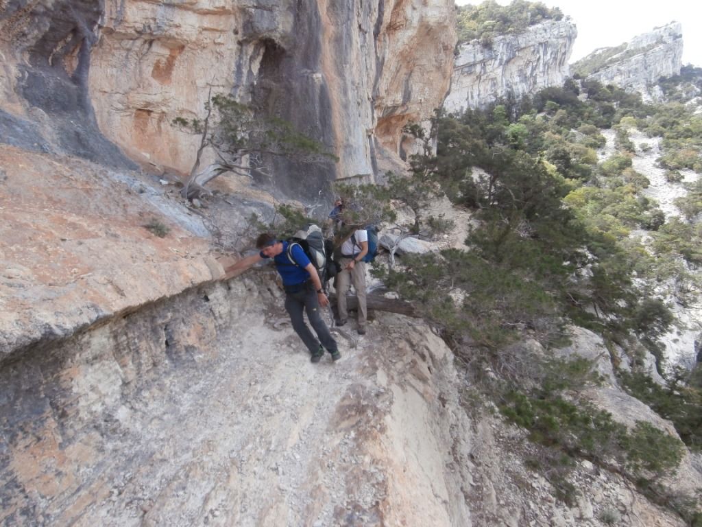 Il mattino successivo alle 7,30 il glorioso Vito Mercedes zebrato già trotta verso sud, destinazione Cala Gonone. Il vecchio amico Gianfilippo ci aspetta al porto con uno dei suoi bellissimi gommoni. Lui è già abbronzato come se fosse agosto. Ha la fortuna di vivere in questo paradiso di sole e natura e di fare un lavoro che gli fa ammirare tutti i giorni questo tratto di costa incantato: 30 km di scogliere e cale protette da un entroterra impenetrabile. Carichiamo le nostre some nella veloce imbarcazione e in pochi minuti il giovane nocchiero ci fa volare fino a Cala Sisine. Il meteo ed il mare sono perfetti e branchi enormi di velelle si fanno trasportare da una brezza a noi impercettibile ma sufficiente al loro lento ed inesorabile viaggiare. Sbarchiamo nella magnifica e selvaggia spiaggia facendo con la manina ciao-ciao a Gianfilippo e a tutti gli agi e le sicurezze del nostro mondo civilizzato. Cala Sisine è infatti una piccola baia che si affaccia nel bel mezzo del golfo di Orosei, raggiungibile solo via mare o dall’interno con un trekking di varia lunghezza in relazione alle condizioni di una pista in parte carrozzabile. L’entroterra di questo gioiello è un labirinto di 6 enormi canyon che risalgono verso quello che è genericamente chiamato Supramonte di Baunei oltre 200 kmq di roccia e macchia, una zona in cui il calcare è stato scolpito e sconvolto dall’acqua e dal vento; un angolo di mondo dove il tempo ha fatto diventare, quella che milioni di anni fa era una barriera corallina, un paradiso per escursionisti, arrampicatori e speleologi, che qui hanno un terreno di esplorazione e di avventura senza pari in Italia.